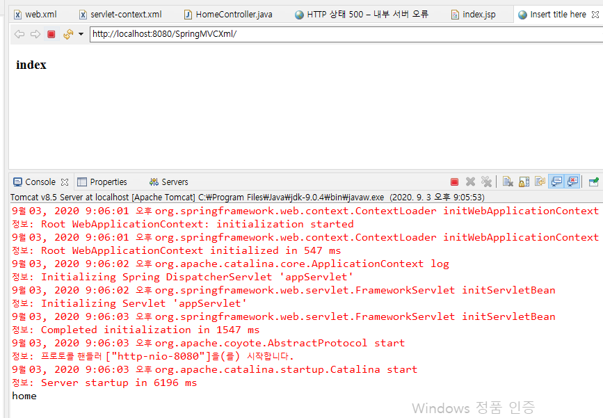 그 후 HomeController 클래스의 home 메소드의 리턴 값을 다음과 같이 수정하면 정상 작동한다.
